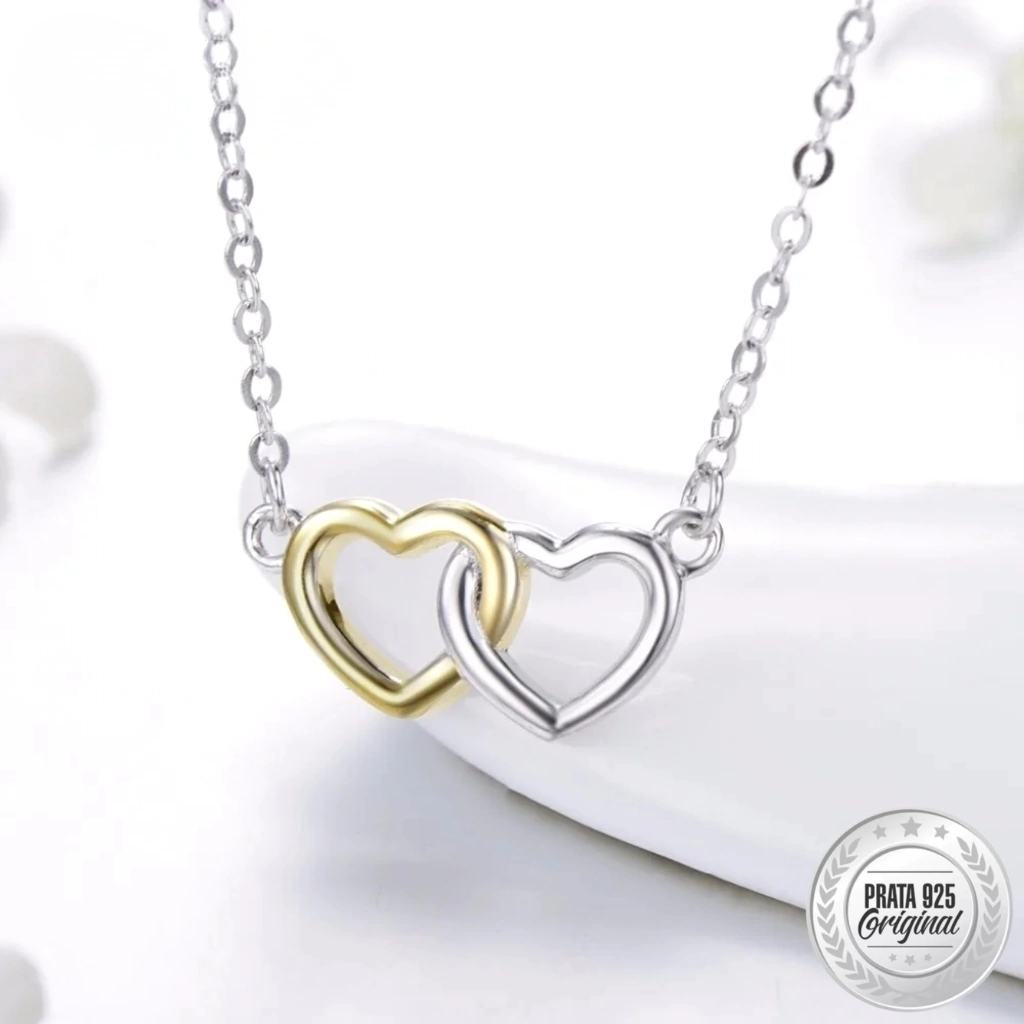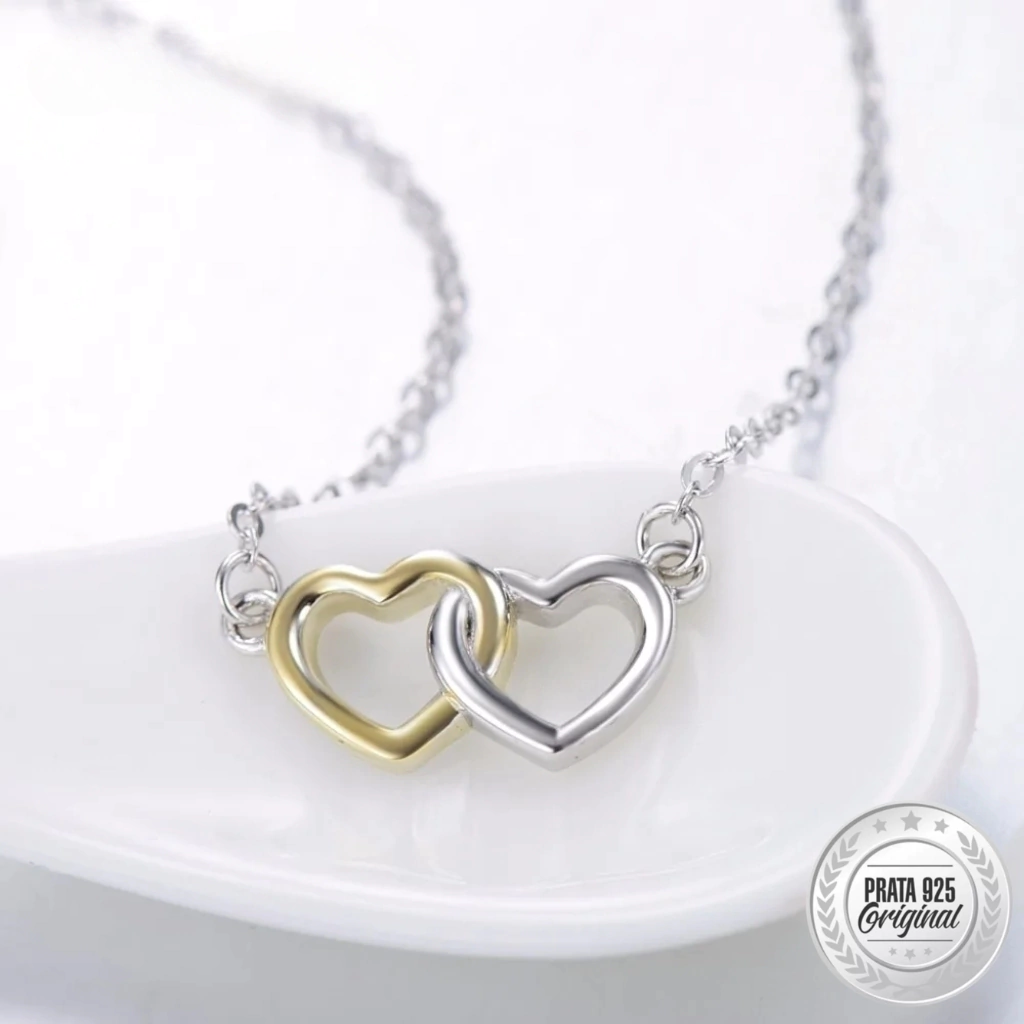 Celebre o amor com o Colar Coração Duplo Modelo Romantic da Vila Suzan. Feito em prata 925 banhada a platina, este encantador colar apresenta dois corações entrelaçados, simbolizando o amor eterno. Adquira o seu e deixe seu coração brilhar com romance e elegância!